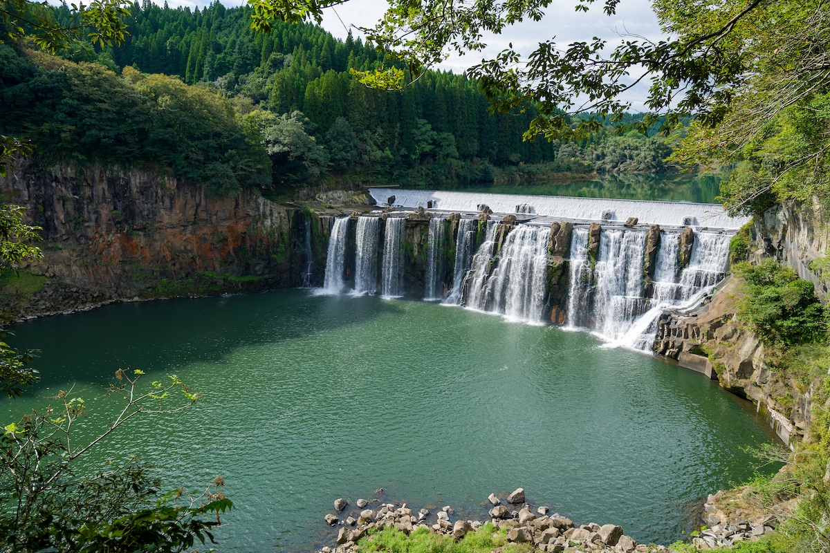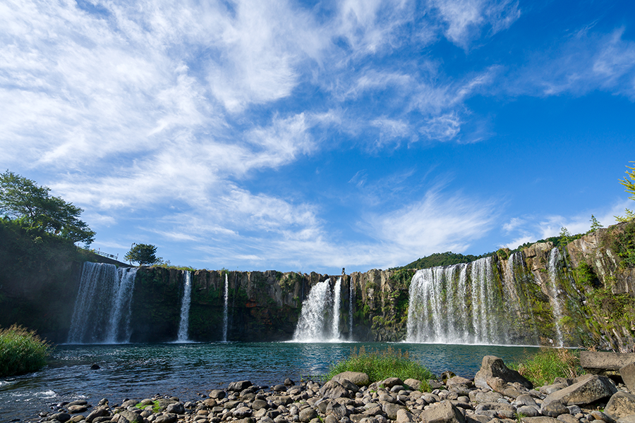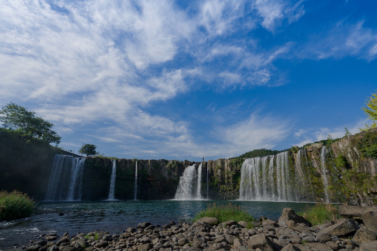 広がる田園の中に突然あらわれるこの滝は、「東洋のナイアガラ」とも呼ばれるほどの迫力で、幅120メートル、高さ20メートルにもおよぶ断崖から、勢いよく水が流れ落ちます。滝のすぐ上流に石橋がかかり、自然と人の営みが重なり合うような風景が広がります。
