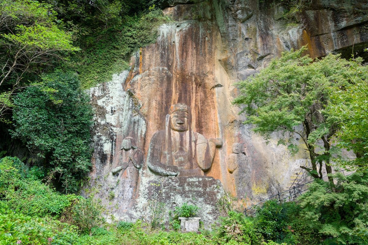 巨大な不動明王が、断崖の岩に直接彫られており、訪れた人を静かに見守っています。この磨崖仏は室町時代に彫られたとされ、時を超えてこの地の人々の祈りや願いを伝えています。初夏には境内にアジサイが咲き誇り、厳かな空間がやさしく彩られます。